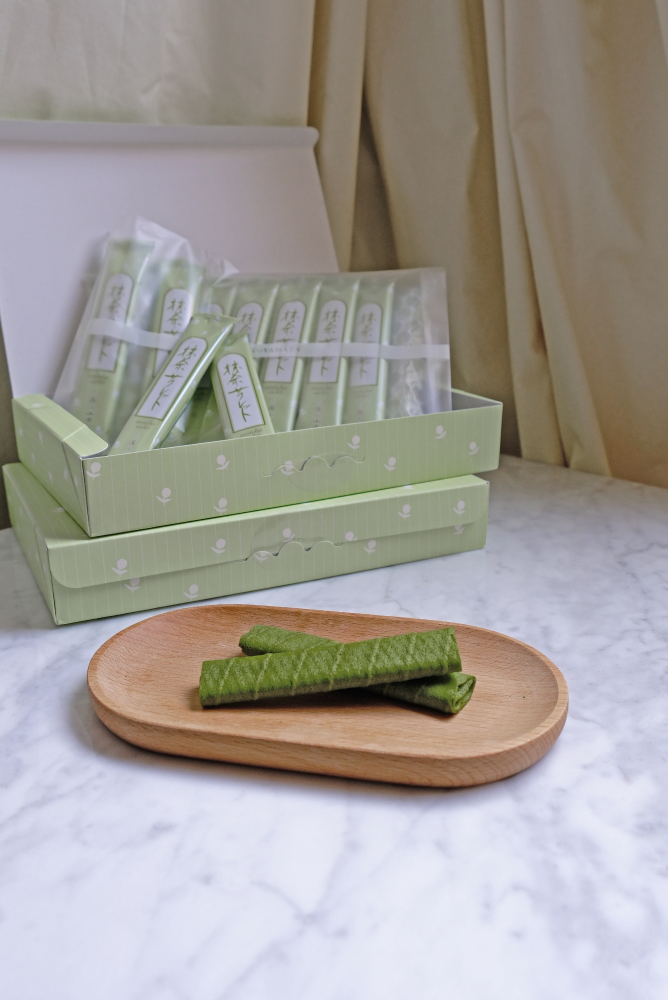A crispy crepe like cookie that is filled a thin layer of white chocolate matcha